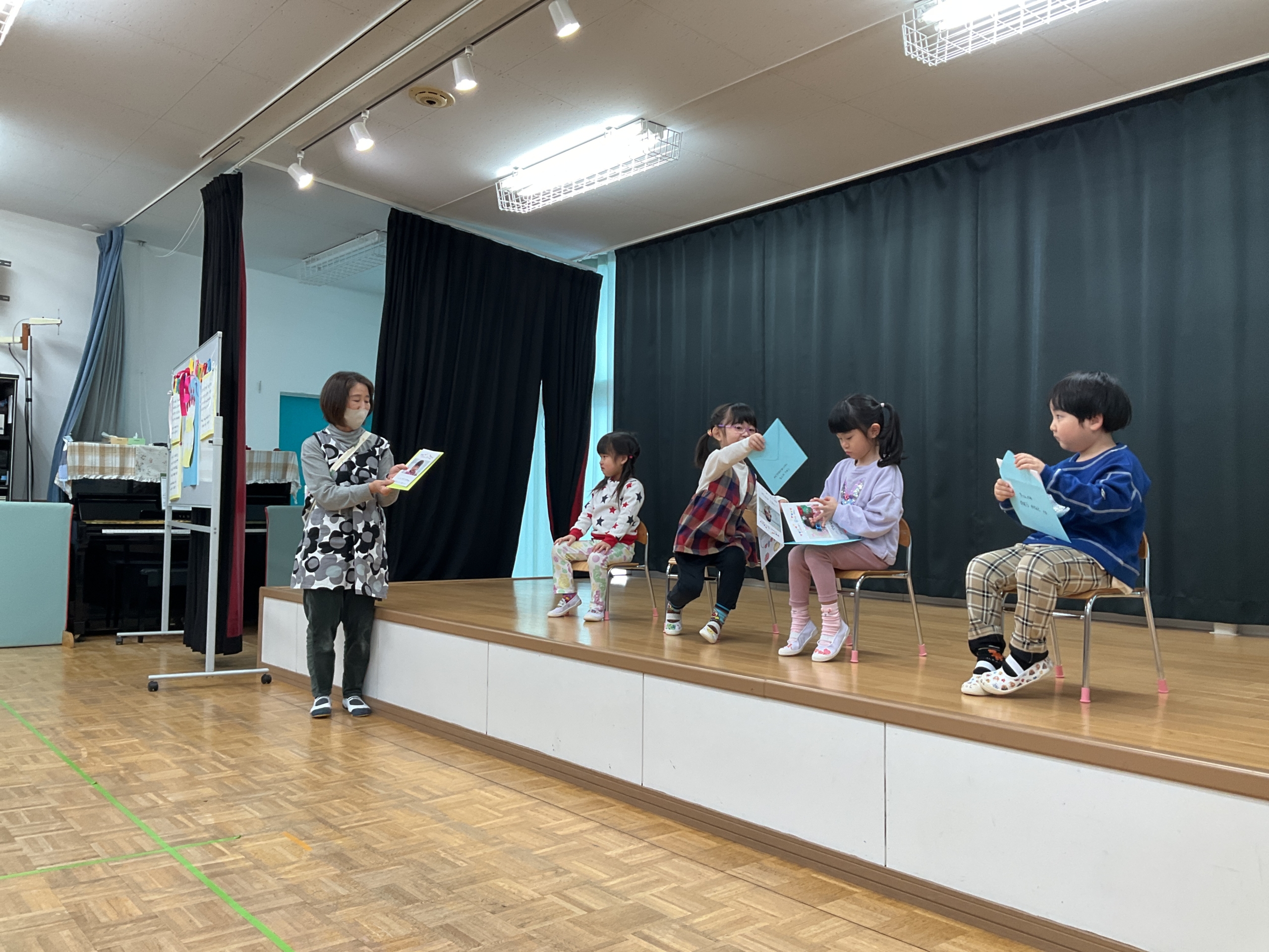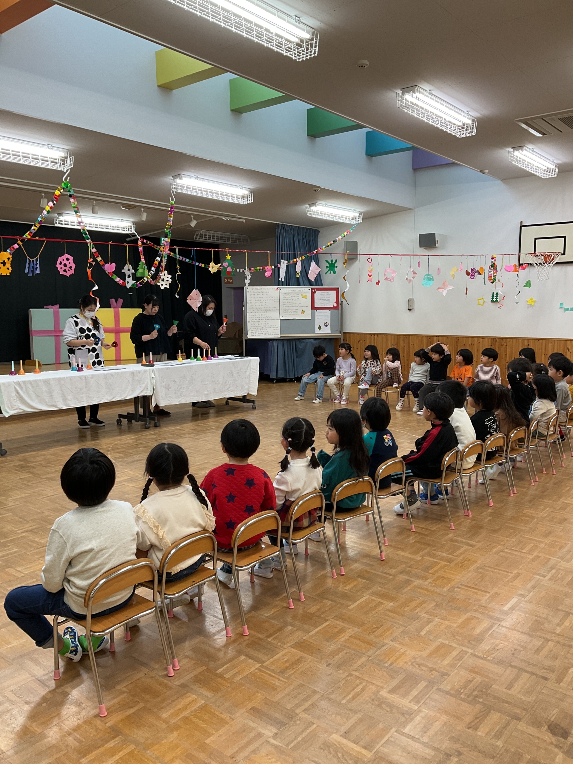 12月25日(木) クリスマス会がありました! クリスマスにちなんだパネルシアターや 絵本の読み聞かせがありました。 先生方による楽器演奏♬ とっても上手でしたね。 サンタさんから手紙が届き、大きなプレゼントが2つ! 子…