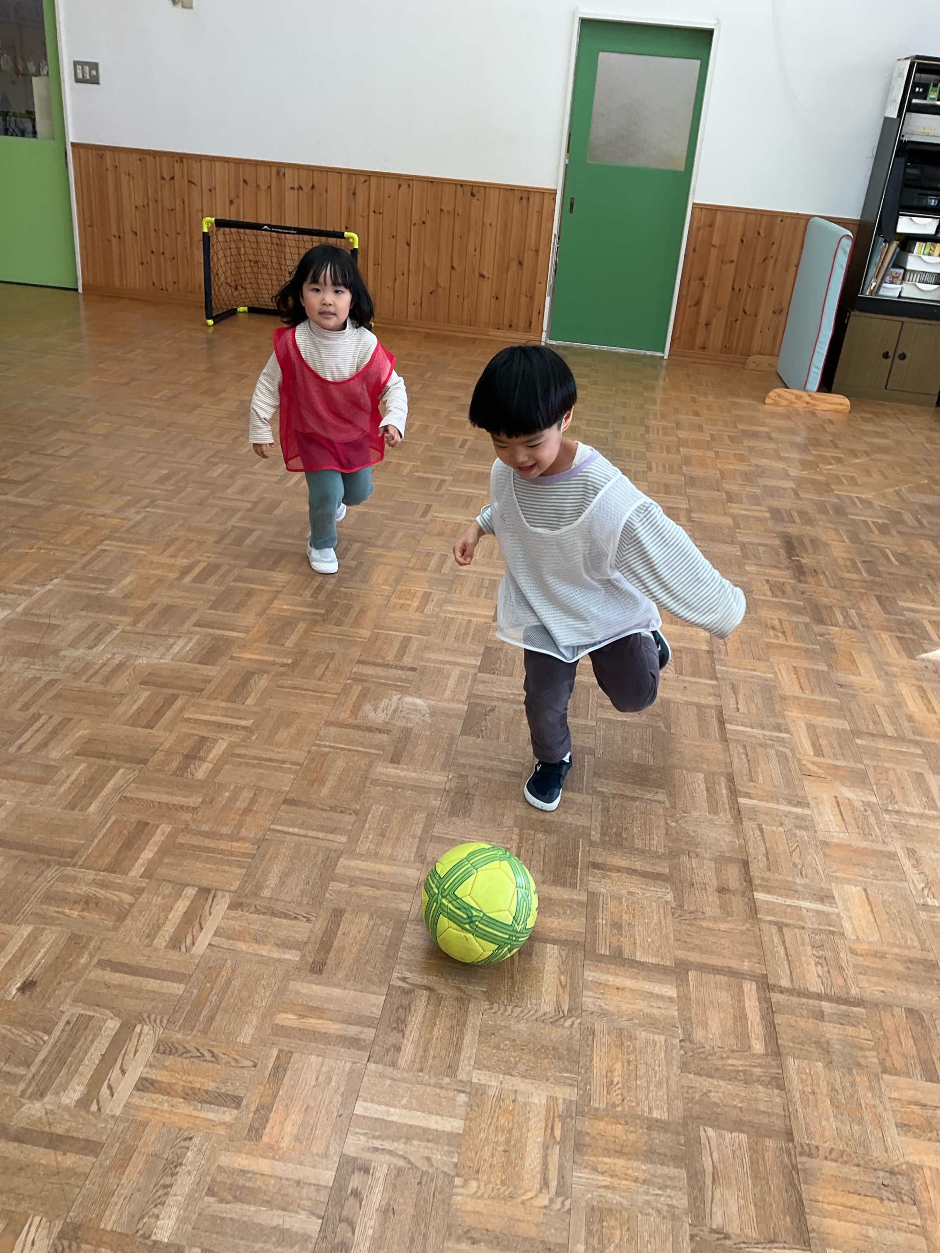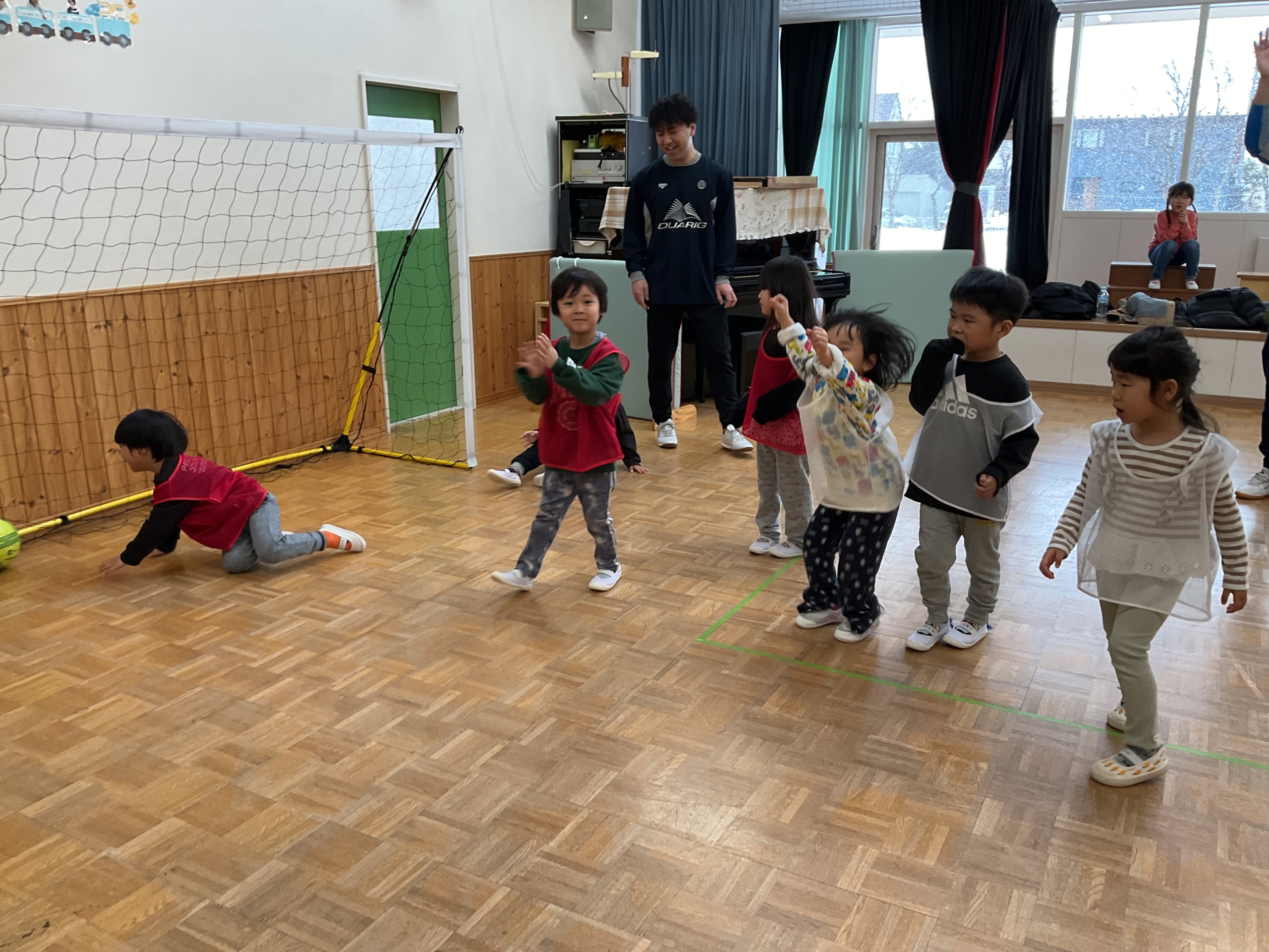1月9日(金) 3.4.5歳児さんのサッカー教室がありました。 ホール(集い)にサッカーをしたい子が集まりました。 パス、シュート練習のあとは待ちに待った試合! みんな真剣な表情でボールを追いかけていました。  …