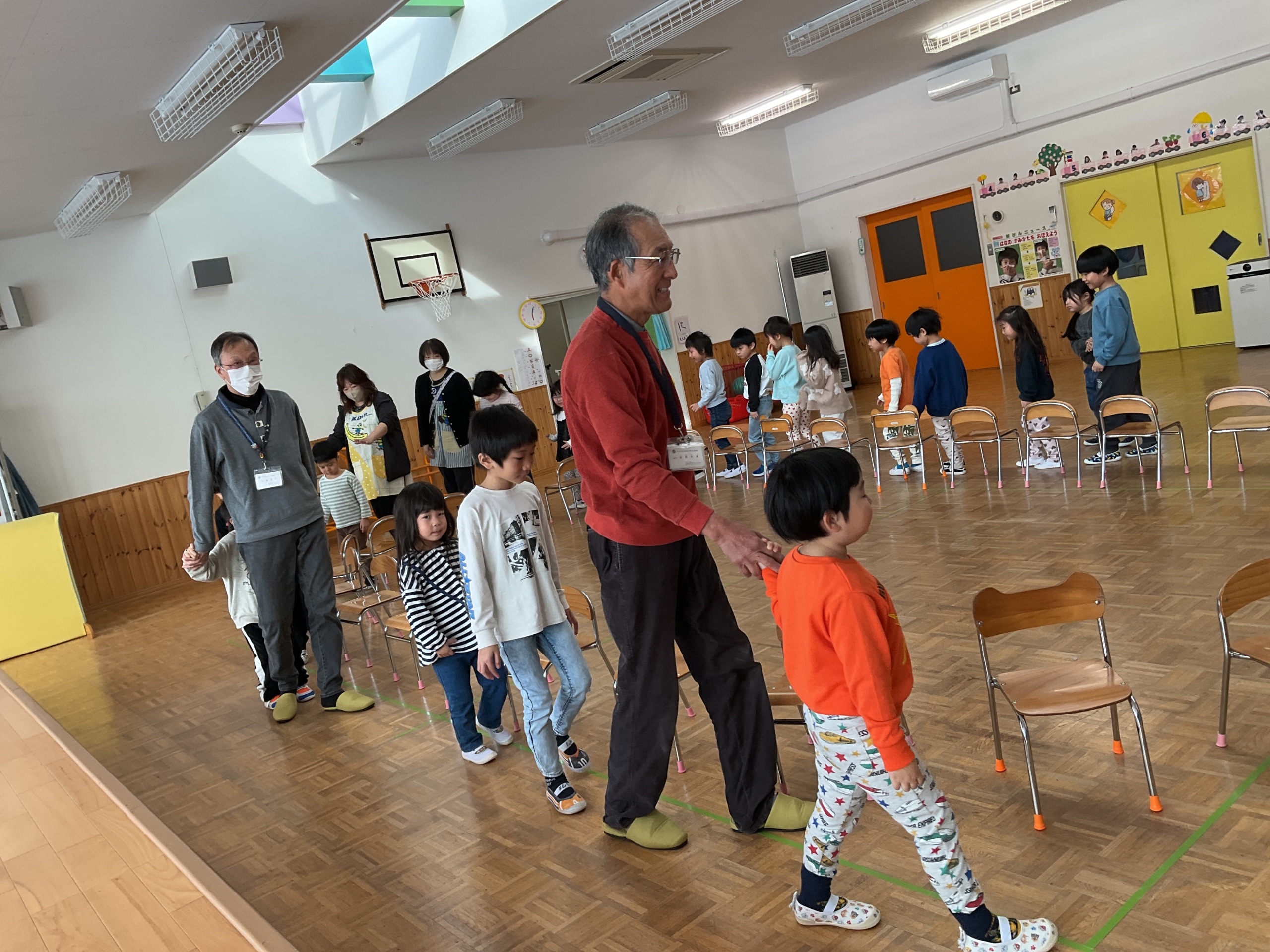 2月12日(木) 3.4.5歳児さんのわくわくデーがありました! この日は民生委員さんとの交流が最後の日でした。 椅子取りゲームとボールを使ったゲームを楽しみました。 ゲームの後は、たくさん遊んでいただいたお礼に 手作り…