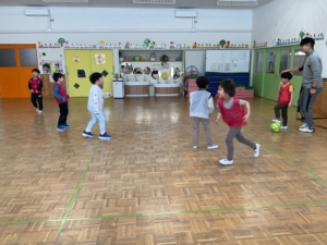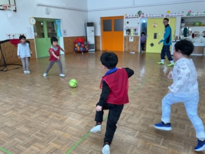 少しずつ、お友達にパスをしようとする姿が