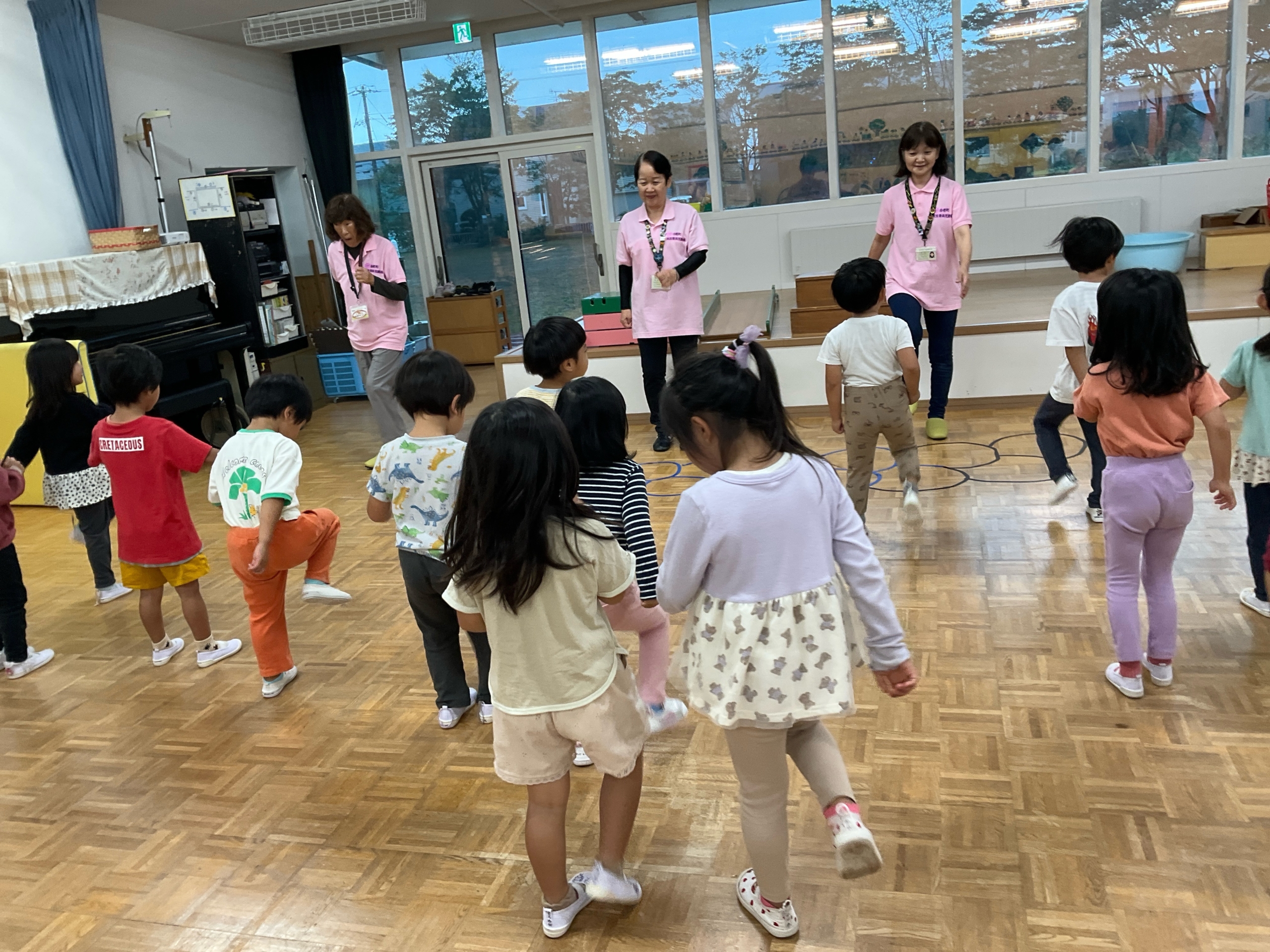 10月1日(水) わくわくデーがありました。 民生委員さんが来てくれて子ども達は大喜び! 一緒に体操をしたり、チーム対抗のゲームをしたりしました。 ただ、この日は朝から悪天候… 洪水警戒レベル4で避難指示が発令されたため…