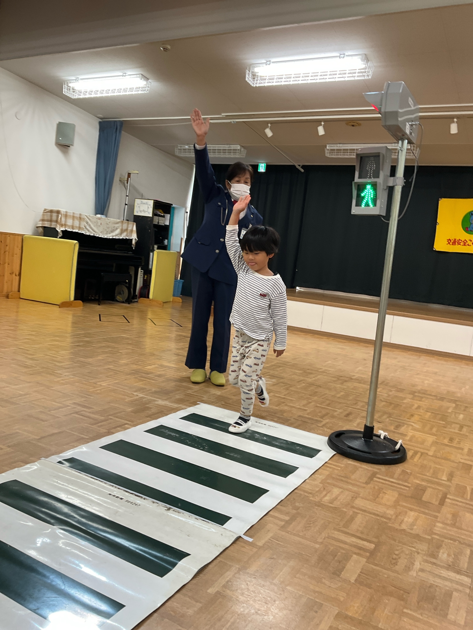 10月7日(火) こぐまクラブでは、 信号の見方を学びました。 3.4歳児さんは集い(ホール)で信号機を見ながら 横断歩道を渡る練習をしました。 5歳児さんは実際に白老小学校前まで歩き 本物の信号機を見て横断歩道を渡りま…