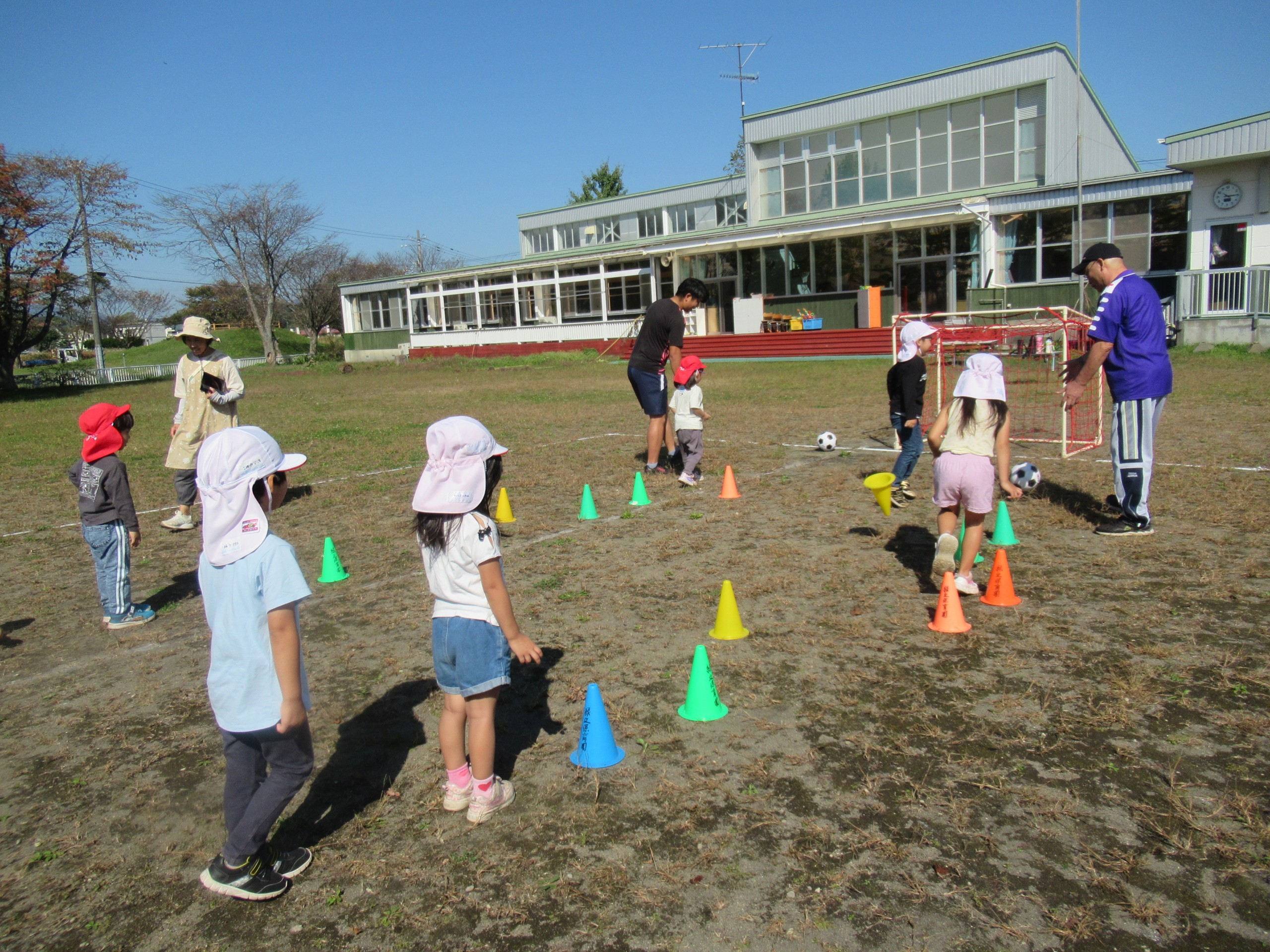 10月3日(金) サッカー教室がありました。 3歳児さん、4歳児さん、5歳児さんの順番に 教えていただきました。 今日は、ジャンプ(両足→右足→右足→両足→左足など) をしてからシュート練習。右左がなかなか難しかったよう…