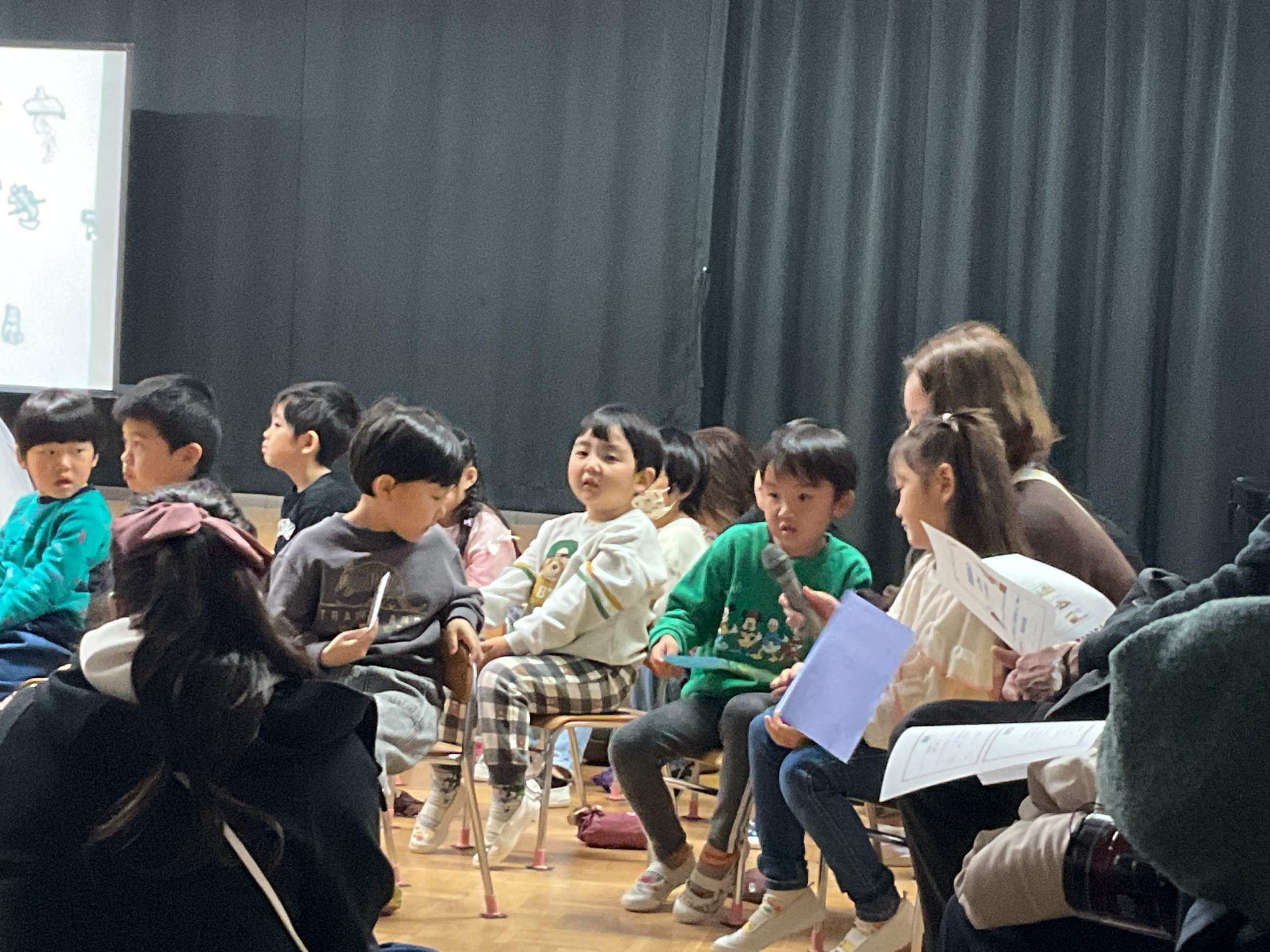 11月29日(土)に3.4.5歳児さんの発表会が ありました。たくさんの保護者の方に足を運んで いただきました。 集いでは 子ども達の遊びや体験をお話にして 『朗読・表現』を発表しました。 スライドでは、『遊びのあしあと…